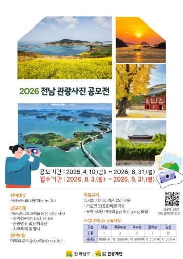 전라남도가 지역의 자연경관과 관광자원을 널리 알리고, 완성도 높은 관광 홍보 콘텐츠를 발굴하기 위해 ‘2026년 전남 관광사진 공모전’을 개최한다.