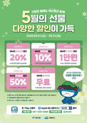 시 관계자는 “가정의 달을 맞아 관광객들이 여수엔을 통해 다양한 할인 혜택과 축제 연계 프로그램을 함께 즐기며 더욱 풍성한 여행을 경험하길 바란다”며 “앞으로도 체감도 높은 혜택과 콘텐츠를 지속적으로 확대해 나가겠다”고 말했다.