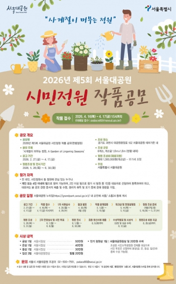 서울대공원이 시민이 직접 정원을 설계하고 가꾸는 2026년 제5회 시민참여정원 작품 공모전을 개최한다. 올해 공모전 주제는 사계절이 머무는 정원으로, 기후 위기 시대에 계절의 변화와 순환의 의미를 되새기고 자연과 사람이 조화를 이루는 지속가능한 정원을 조성하자는 취지를 담았다.