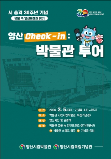 양산시립박물관은 시 승격 30주년과 양산 방문의 해를 맞아 3월 5일부터 양산 시민과 관광객을 대상으로 박물관 투어 특별 이벤트를 운영한다고 밝혔다.