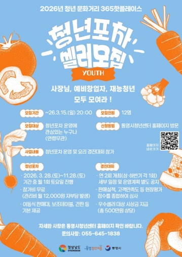 통영시는 청년 삶의 질 향상과 청년 문화 기반 조성을 위해 추진 중인 2026년 청년 문화거리 365 핫플레이스 조성 사업의 일환으로 청년포차 운영 셀러를 모집한다고 4일 밝혔다.