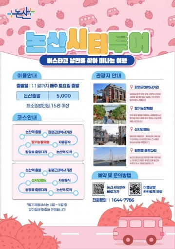상반기에는 논산을 대표하는 체험 콘텐츠인 딸기농장 체험을 중심으로 코스가 운영된다. 참가자들은 싱그러운 농촌 풍경 속에서 딸기 수확 체험과 함께 지역 곳곳의 관광지를 둘러보며 논산의 봄을 만끽할 수 있다. 하반기에는 선샤인랜드를 중심으로 한 테마 코스로 전환돼 계절과 콘텐츠에 맞춘 다양한 관광 경험을 제공할 예정이다.