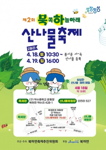 전남 장성군 북하면의 자연과 전통을 담은 마을축제 ‘제2회 북쪽 하늘아래 산나물 축제’가 오는 4월 18일부터 19일까지 이틀간 옛 약수중학교 운동장에서 열린다.