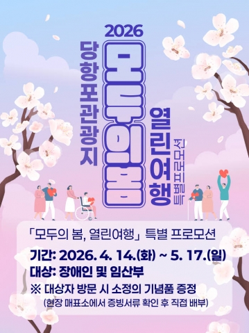 고성문화관광재단은 당항포관광지가 관광 취약계층의 여행 접근성을 높이기 위한 이번 프로모션에 참여해 다양한 혜택과 홍보를 추진한다고 밝혔다. ‘2026 모두의 봄, 열린여행’은 장애인과 고령자 등 관광 소외계층이 보다 편안하게 국내 관광지를 이용할 수 있도록 지원하는 전국 단위 관광 캠페인으로, 지자체와 민간 관광사업체가 함께 참여해 특화 혜택을 제공한다.