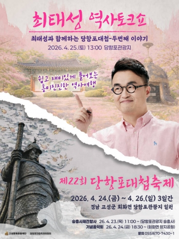 고성문화관광재단은 오는 4월 25일 당항포관광지 이순신 테마구역 거북선 앞에서 ‘경남학생 백일장·사생대회’와 ‘최태성과 함께하는 당항포대첩 – 두 번째 이야기’를 연이어 개최한다고 밝혔다. 이번 프로그램은 당항포대첩의 역사적 의미를 현대적 감각으로 재해석해 누구나 쉽고 흥미롭게 이해할 수 있도록 기획됐다.