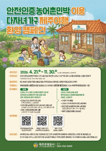 제주관광공사(사장 고승철)는 4월 21일부터 11월 30일까지 ‘안전 인증 농어촌민박 이용 다자녀 가구 제주여행 환영 캠페인’을 추진한다고 밝혔다. 이번 캠페인은 다자녀 가구의 제주 방문을 유도하는 동시에 도내 안전 인증 농어촌민박 이용을 활성화하기 위해 마련됐다.