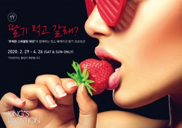 호텔 서울드래곤시티의 독특한 엔터테인먼트 공간인 ‘스카이 킹덤’ 31층에 위치한 라운지 바 ‘킹스베케이션(King’s Vacation)’에서는 스파클링 와인과 함께 하는 딸기 뷔페 ‘딸기 먹고 갈래?’를 선보인다. ‘딸기 먹고 갈래?’는 국내 유일 성인들만 이용 가능한 딸기 디저트 뷔페로 특급 호텔 파티시에가 만든 15여 종의 딸기 디저트와 무제한 스파클링 와인을 제공한다.